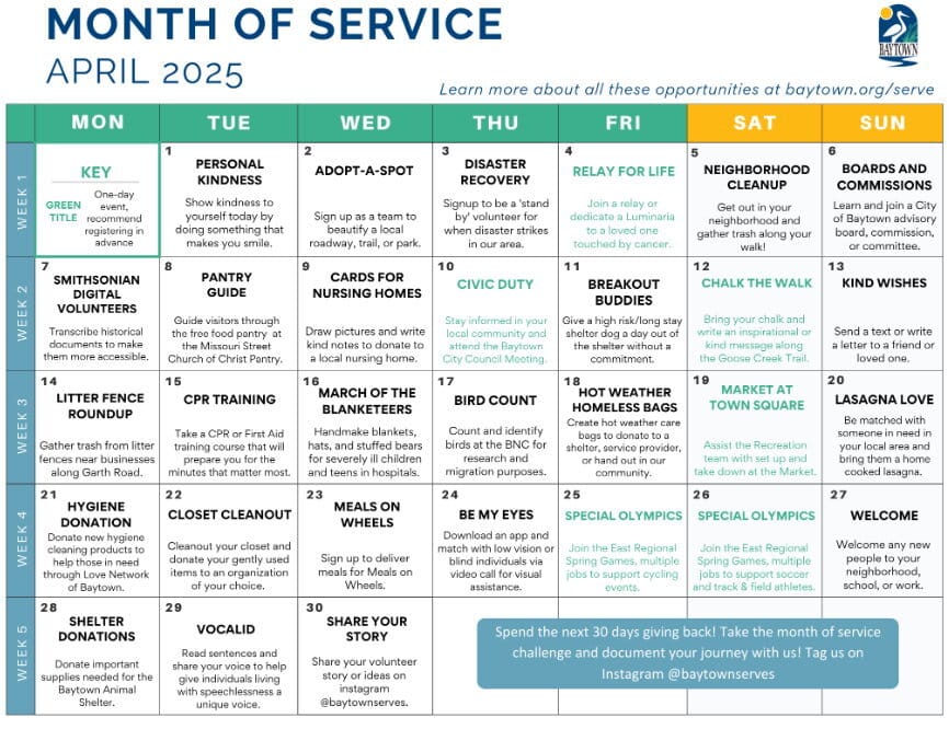 The City of Baytown is asking everyone to join them for a month of making a difference! This April, they’re celebrating their Month of Service, and want YOU to be part of it.