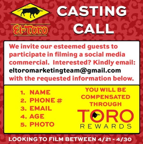 El Toro is reaching out to all of their dedicated guests to make them aware that they are looking to film an upcoming social media commercial for the summer.