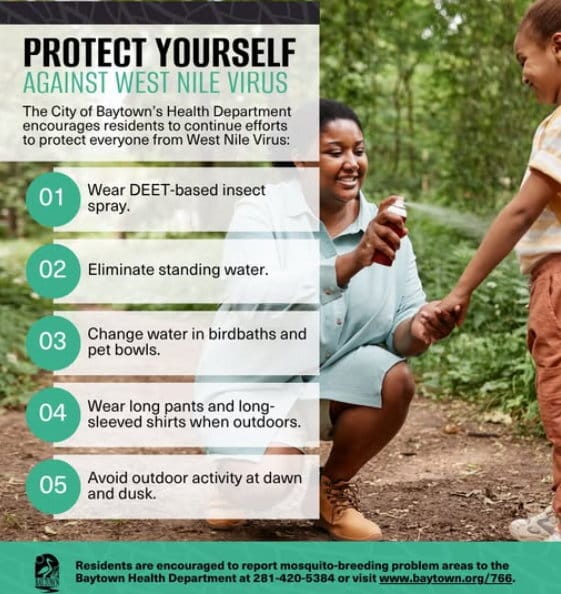 The City of Baytown has been notified of a confirmed human case of West Nile Virus, reported by Harris County Public Health and Environmental Services (HCPHES). While the individual has not been identified, City officials are taking immediate action to prevent any additional cases from occurring.