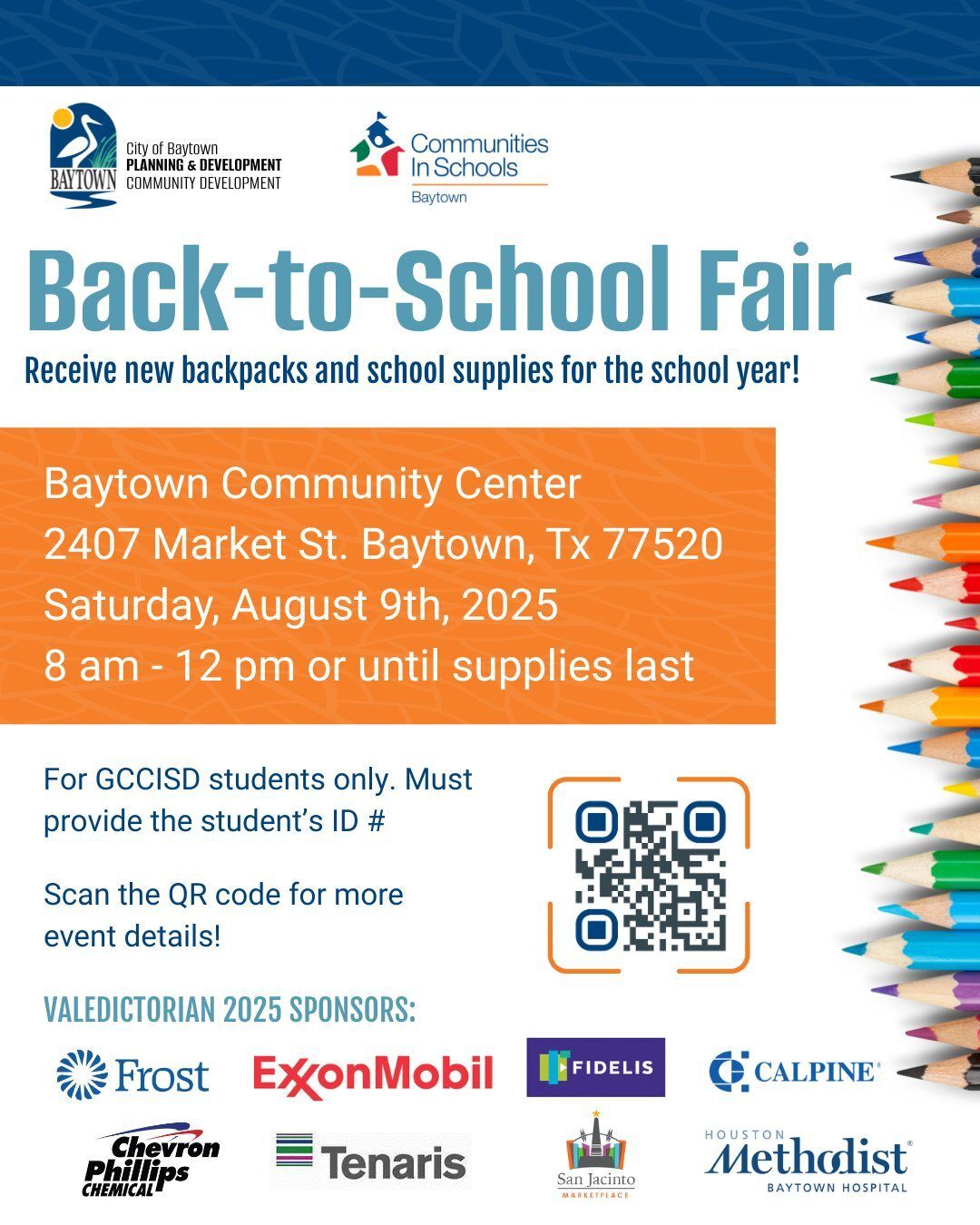 +Back to School Fair for GCCISD– Sat. Aug. 9th | 8:00am-12:00pm (or til supplies run out) Baytown Community Center, 2407 Market St. Baytown