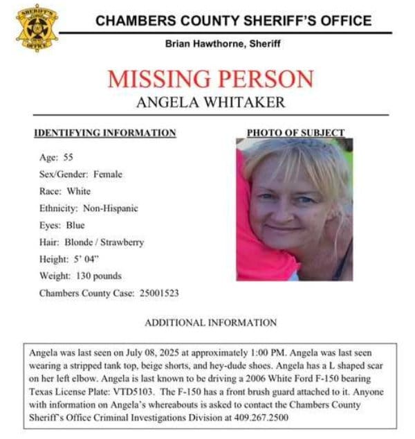 The Chambers County Sheriff’s Office is asking for the public’s assistance in locating 55-year-old Angela Whitaker, who was last seen on July 8, 2025, at approximately 1:00 p.m.