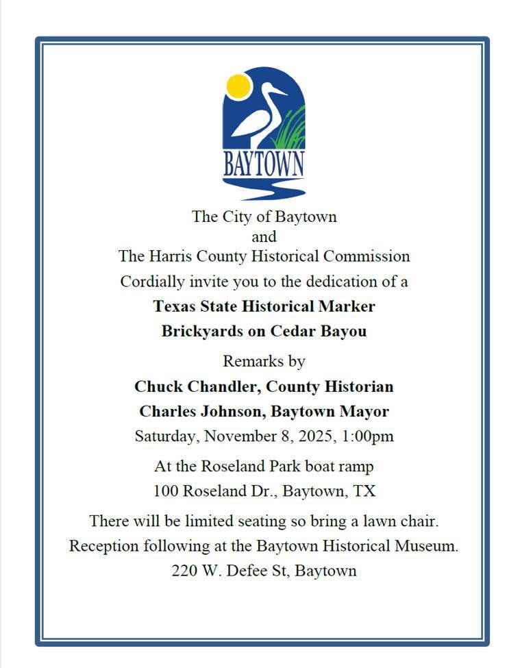 There will be a Dedication Ceremony and Reception for the Texas State Historical Marker recognizing the Brickyards on Cedar Bayou.