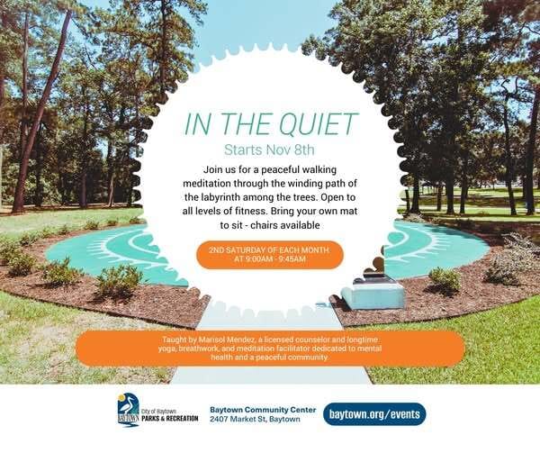 Held the second Saturday of each month from 9:00 to 9:45 a.m. beginning November 8th at the Labyrinth behind the Baytown Community Center, 2407 Market Street.