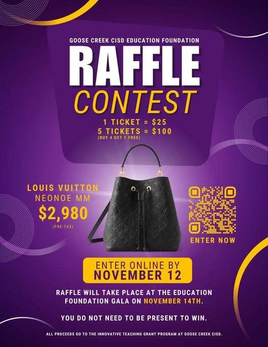 The Goose Creek CISD Education Foundation is raffling a Louis Vuitton Néonoé MM purse (valued at $2,980), and tickets are only $25 each or 5 for $100!
