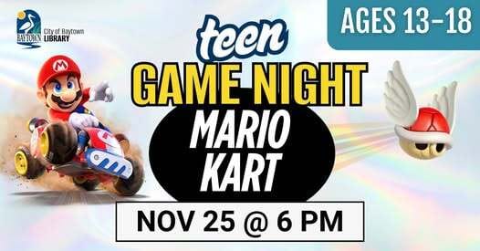 Teen Game Night is racing in with Mario Kart! Enjoy some friendly competition, or just play for fun!