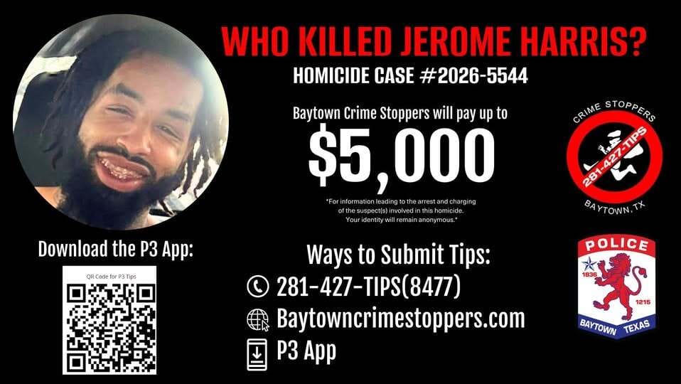 👉Tips can be submitted anonymously by contacting Baytown Crime Stoppers at (281) 427-TIPS (8477), online, or through the P3 Tips app available in the Apple App Store and Google Play.