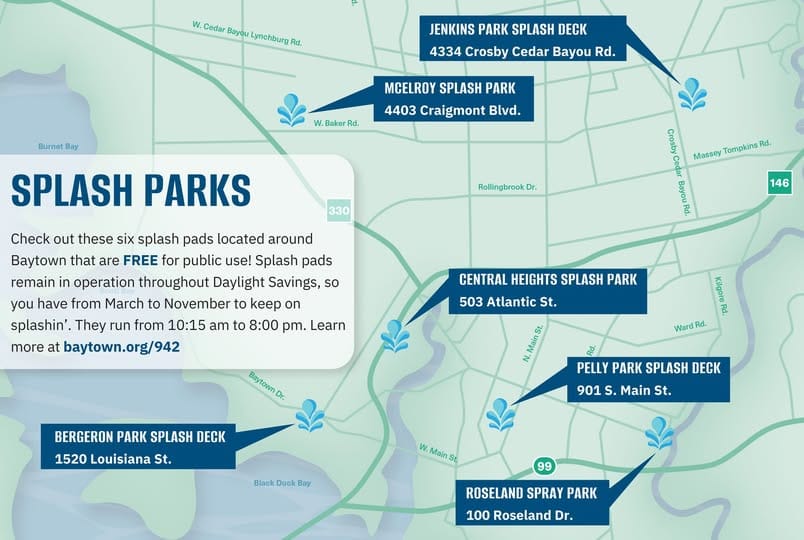 Mark your calendars — Baytown splash pads open March 8 and will run daily from 10:15 AM to 8 PM. The season lines up with Daylight Saving Time, so get ready for longer, brighter days of fun.