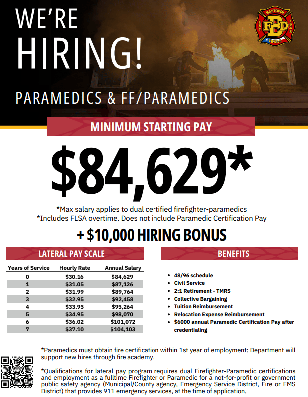 The Baytown Fire Department is now hiring Firefighter/Paramedics and Paramedics (with fire academy training included)!